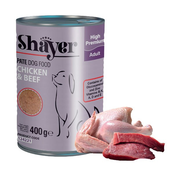 کنسرو پته سگ شایر طعم مرغ و گوشت وزن 400 گرم