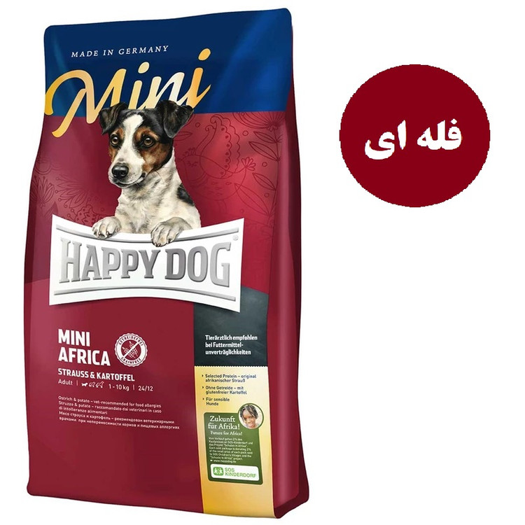 غذای فوق العاده خوش طعم، بسیار مرغوب و کامل Happy Dog Mini Africa برای همه سگهای بدغذا و حساس، ایدهآل میباشد، به دلیل اینکه این غذای هپی داگ مخصوص سگ، از ترکیب گوشت شتر مرغ و سیب زمینی تشکیل شده تا یک دستور غذائی منحصر به فردی به وجود بیاورد. شتر مرغ یک منبع پروتئینی خیلی خاص است که برای سگهای با حساسیت غذائی ایدهآل می سازد. سیب زمینی شامل گلوتن نمیباشد و بنابراین برای حیواناتی که تحمل غلات را ندارند توصیه می شود. مواد مغذی اسیدهای چرب امگا ۳ و امگا ۶ برای سلامتی پوست و پوشش موئی براق مهم می باشد که در این دستور غذائی منحصر به فرد گردآوری شده است. کروکت های خیلی کوچک به طور کامل با دندانهای سگ های نژاد کوچک مطابقت داده شده است.