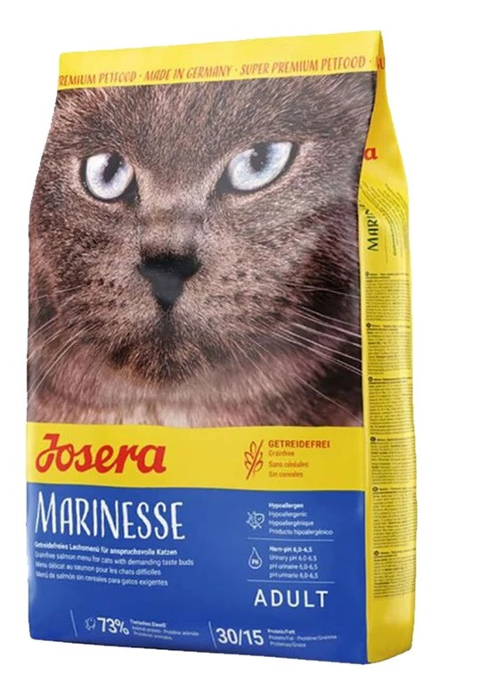 غذای گربه مارینس از برند جوسرا حاوی ماهی سالمون ، سیب زمینی ،موادمعدنی ، پروتئین و ویتامین های ضروری و لازم بدن گربه های بالغ حساس و بد غذاست. است. ضد حساسیت و فاقد گلوتن و غلات بوده و مانع از تشکیل سنگ های ادراری می شود.