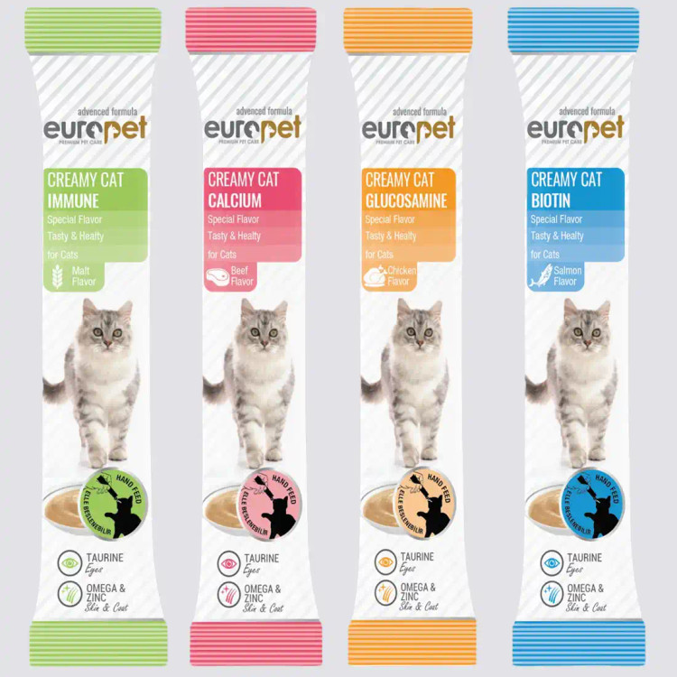 بستنی گربه یورو پت در بسته بندی تکی در طعم های مختلف یک میان وعده مقوی برای گربه های بالای 5 ماه محسوب می شود. این بستنی دارای همه ویتامین های لازم برای رشد بچه گربه ها است. محصولات یوروپت تولید کشور ترکیه است.