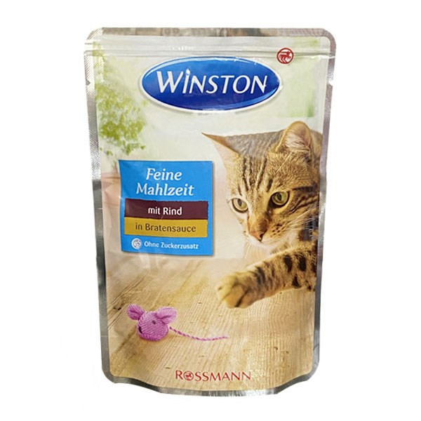 پوچ گربه وینستون طعم گوشت گاو در سس گوشت برای گربه های بالغ بد غذا تولید شده؛ غنی از تورین و بیوتین و فاقد قند، رنگ و مواد نگهدارنده است.