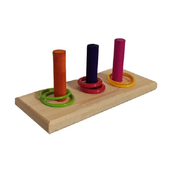 اسباب بازی فکری حلقه و میله یک سرگرمی بسیار عالی برای پرندگان و طوطی های دلبند شما ؛ این بازی متشکل از سه میله چوبی و حلقه های پلاستیکی رنگی میباشد، اسباب بازی طوطی ها میتواند در خلق و خو و رفتار آنها بسیار تاثیرات مثبتی داشته باشد و روحیه آنها را بهتر و شاداب تر کند . این محصول مناسب تمامی طوطی های متوسط و بزرگ جثه میباشد، مثل عروس هلندی - راهب - گرینچیک - شاه طوطی - کاسکو و سایر پرندگان هم سایز . رنگ تمامی قطعات این بازی با استفاده از رنگهای خوراکی و کاملا ایمن میباشد.