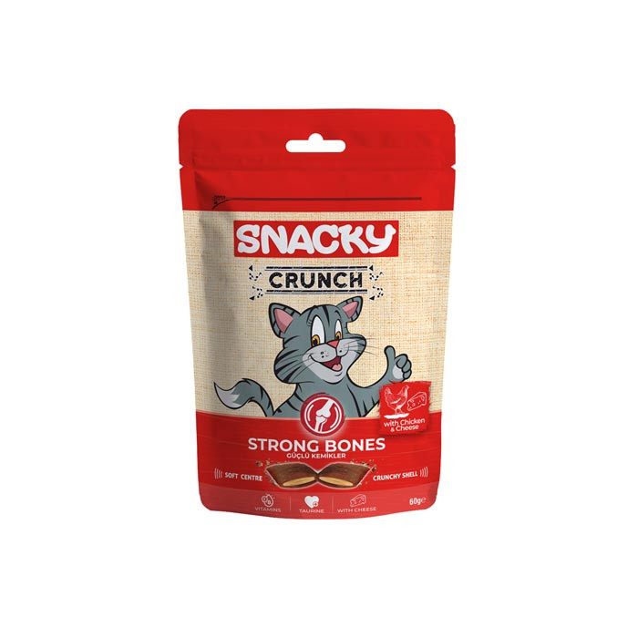 اسنکی کرانچ استرانگ بونز (تقویت استخوانها) با طعم مرغ و پنیر Snacky Crunch Strong Bones with Chicken & Cheese بهترین تشویقی مغزدار گربه با کیفیت سوپر پریمیوم جهانی برای نیازهای تکمیلی گربههای شماست و مخصوص تغذیه اضافی و پاداشهای گهگاهی طراحی شده است. پوست خارجی آن لذتآور خوراکی و خوشمزه است و لایه داخلی آن نرم و لذیذ تولید شده است.