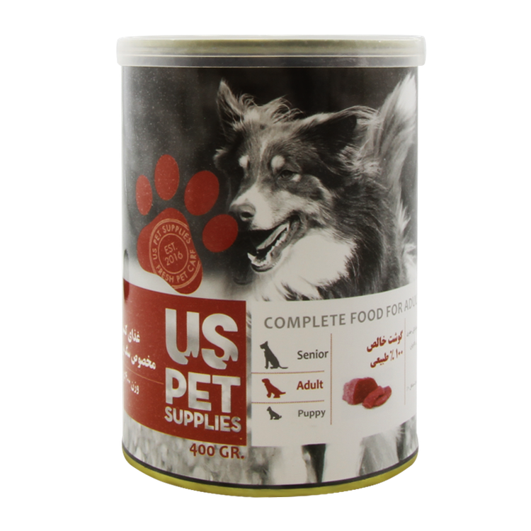 کنسرو سگ بالغ یو اس پت (Us Pet) در چهار طعم گوشت خالص و گوشت گوساله ، گوشت مرغ و گوشت بره، سیرابی و کدو تنبل از مواد صد در صد طبیعی و تازه تهیه شده است. این محصول حاوی انواع ویتامین ها و مواد معدنی است. با توجه به داشتن مقدار قابل ملاحظهای از امگا 3 و 6 به نگهداری سلامت پوست و مو و همچنین جلوگیری از ریزش مو قابل توجهی مینماید. این وعده غذایی حاوی پروتئین، کربوهیدرات، مواد معدنی، فیبر و چربی، ترکیب مایعات و افزودنیهای طبیعی مغذی است. وزن کنسرو 400 گرم و تولید ایران است.